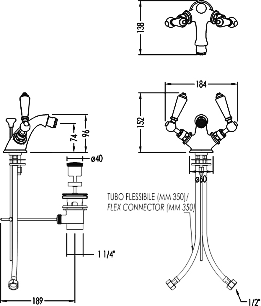 Смеситель имеет хромированное покрытие, которое придает ему современный и привлекательный вид. Высота смесителя составляет 152 мм, длина — 138 мм, а ширина — 184 мм, что делает его компактным и удобным для установки на биде. Уникальная форма излива и традиционный дизайн делают его универсальным решением для любого интерьера.