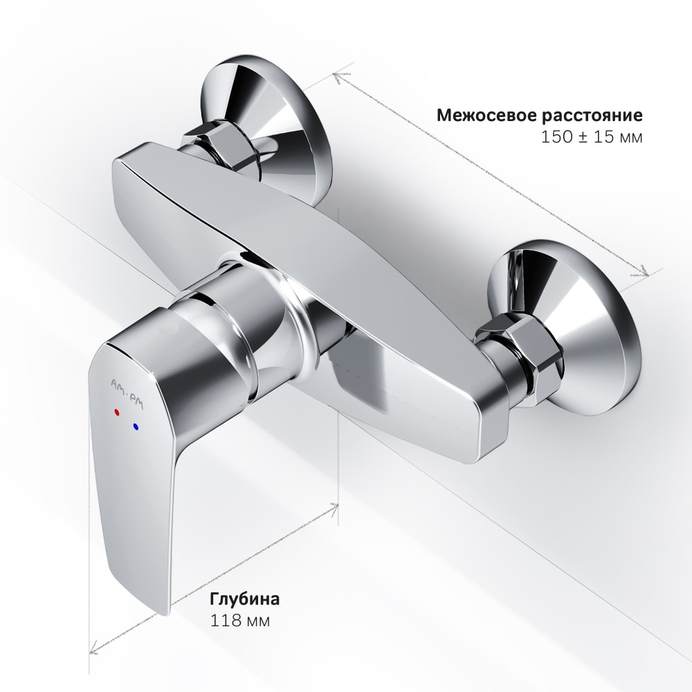 Смеситель предназначен для монтажа на стену и подходит для установки на два отверстия. Его размеры (высота - 118 мм, длина - 118 мм, ширина - 215 мм) делают его универсальным решением для различных интерьеров. Уникальный шестигранный дизайн, разработанный австрийскими дизайнерами из Product Identity AM.PM - GP designpartners, выделяет его среди стандартных моделей и придаёт вашей ванной комнате современный и брутальный вид.