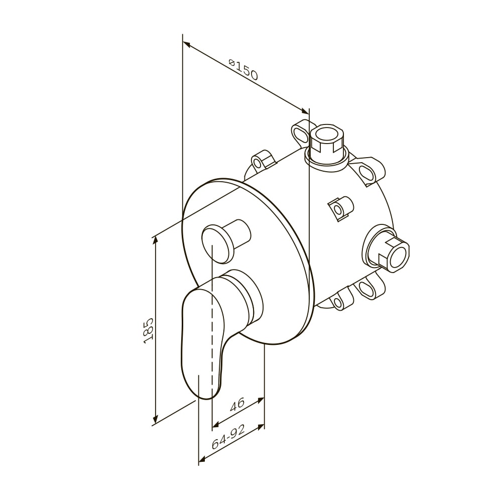 Смеситель выполнен в элегантном хромированном цвете и имеет размеры: высота 185 мм, длина 63 мм и ширина 150 мм. Он предназначен для монтажа на стену и оснащен двумя отверстиями для подводки воды стандартного размера 1/2". Благодаря рычажному управлению, вы сможете легко и быстро регулировать температуру и напор воды, что обеспечивает максимальный комфорт во время принятия душа.