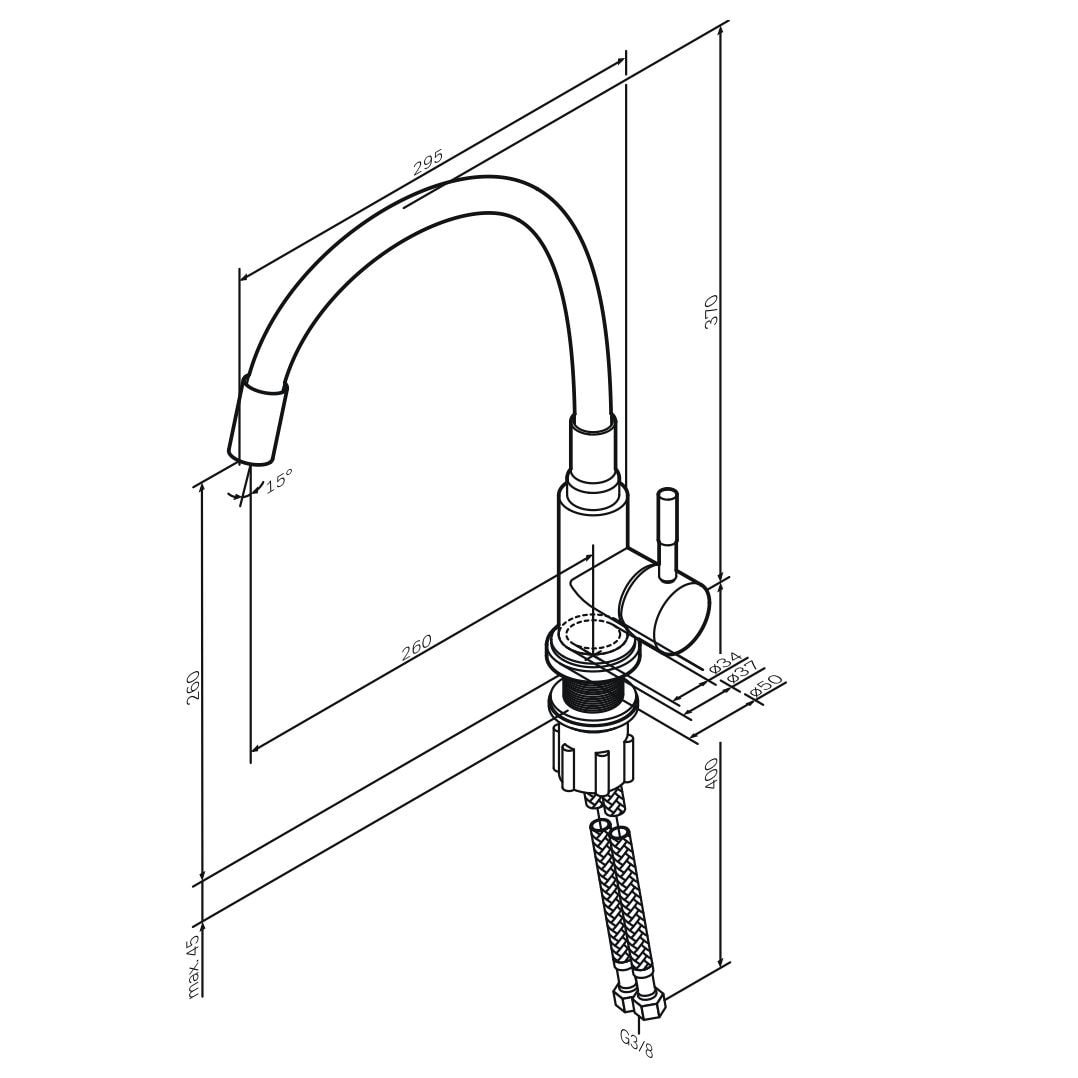 Смеситель AM.PM X-Joy S предлагает уникальную возможность управления с помощью рычага, что делает его использование простым и удобным. Высота смесителя составляет 370 мм, а длина излива — 295 мм, что позволяет легко наполнять большие кастрюли и другие ёмкости.