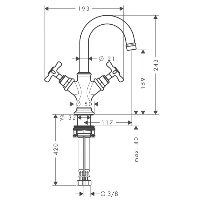 Смеситель выполнен из прочной латуни и предназначен для монтажа на столешницу. Его высота составляет 243 мм, а ширина — 193 мм, что позволяет удобно использовать его в сочетании с различными раковинами. Высокий излив и ламинарная струя обеспечивают комфортное использование, а диапазон поворота в 120° добавляет удобства при мытье.