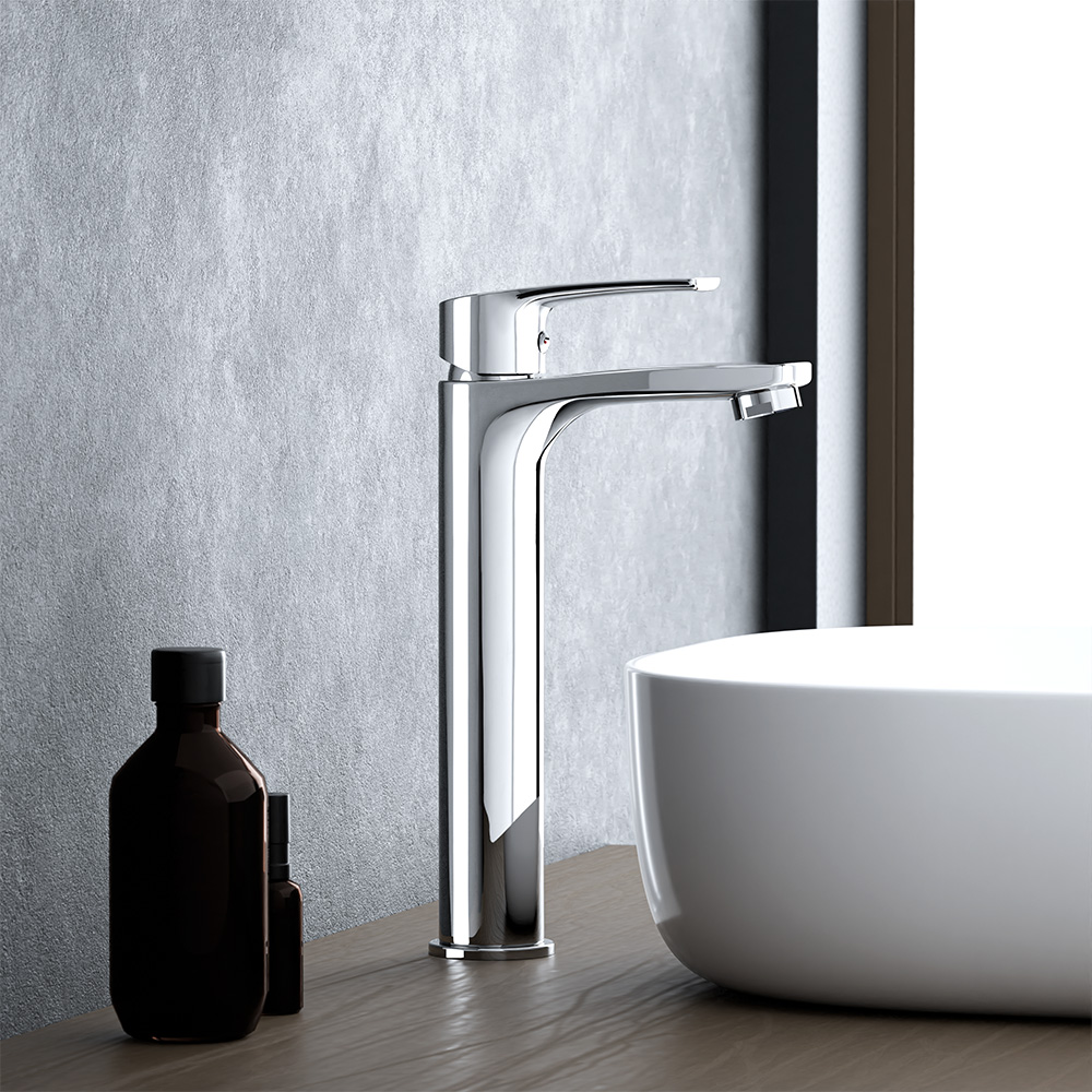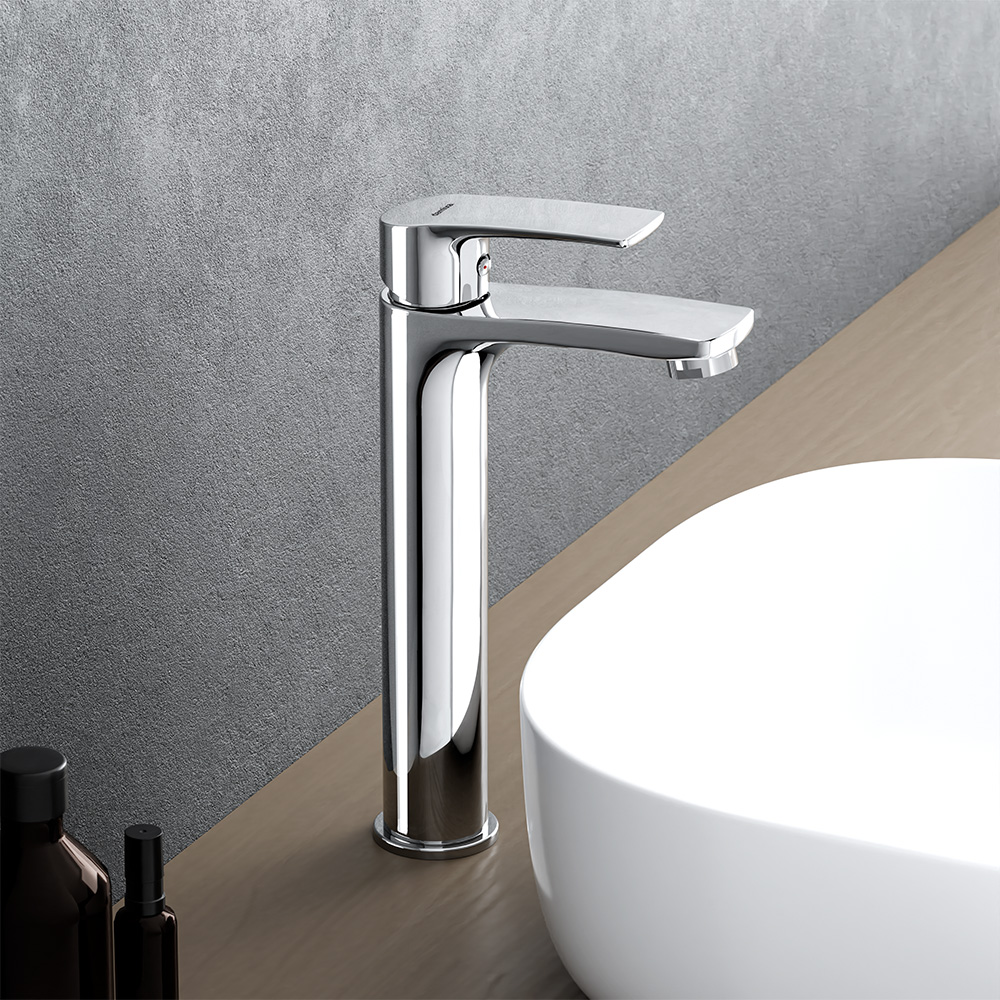 Смеситель предназначен для монтажа на раковину и требует всего одно отверстие для установки. Высокий излив позволяет легко наполнять большие емкости и обеспечивает комфортное использование. Управление смесителем осуществляется с помощью рычага, что делает процесс регулировки температуры и напора воды простым и интуитивно понятным.