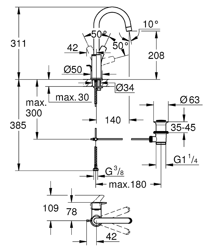 С высотой 311 мм, длиной 175 мм и шириной 50 мм, смеситель имеет высокий излив, что делает его удобным в использовании. Он предназначен для монтажа на одну раковину и оснащен керамическим картриджем, который обеспечивает плавный ход рычага и точный контроль температуры и напора воды.