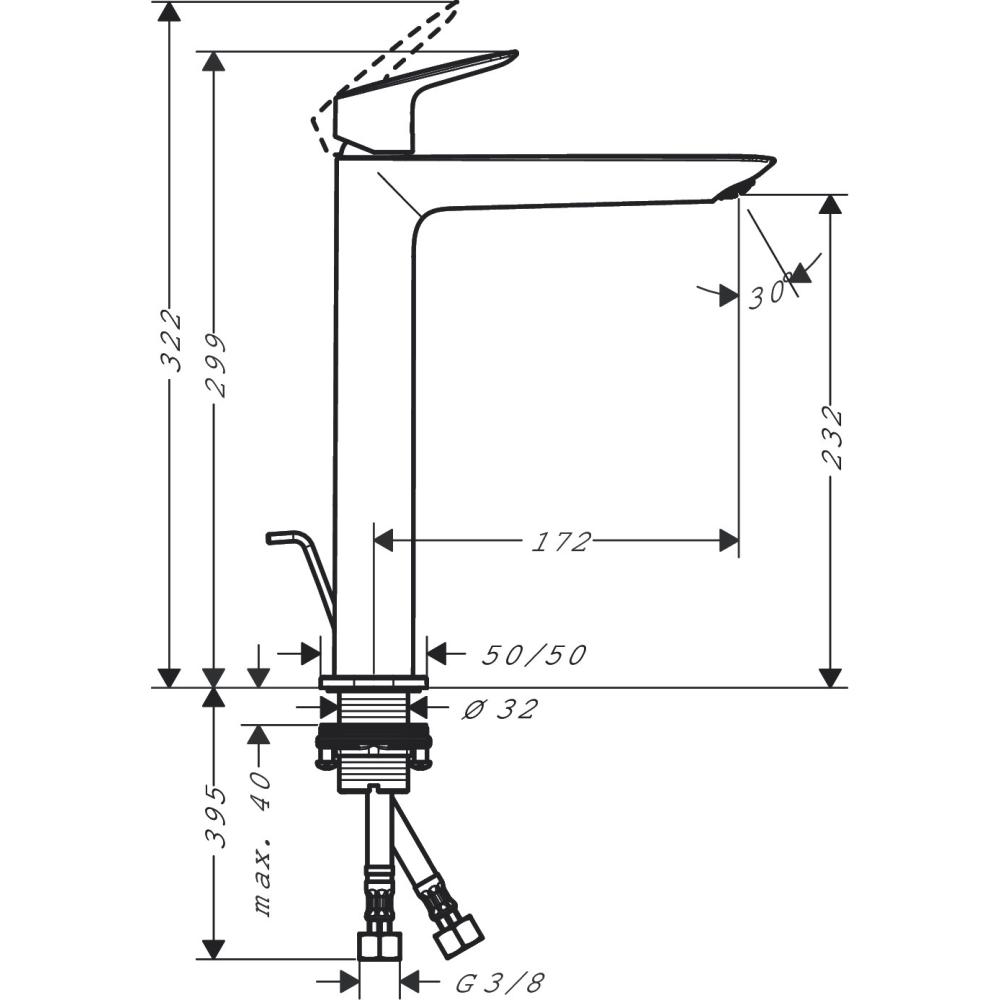 Смеситель предназначен для монтажа на раковину и имеет высокий излив, что обеспечивает удобство использования. Высота смесителя составляет 322 мм, а ширина — 32 мм, что позволяет ему гармонично вписаться в любой интерьер. Глубина смесителя составляет 172 мм, что делает его компактным и практичным.