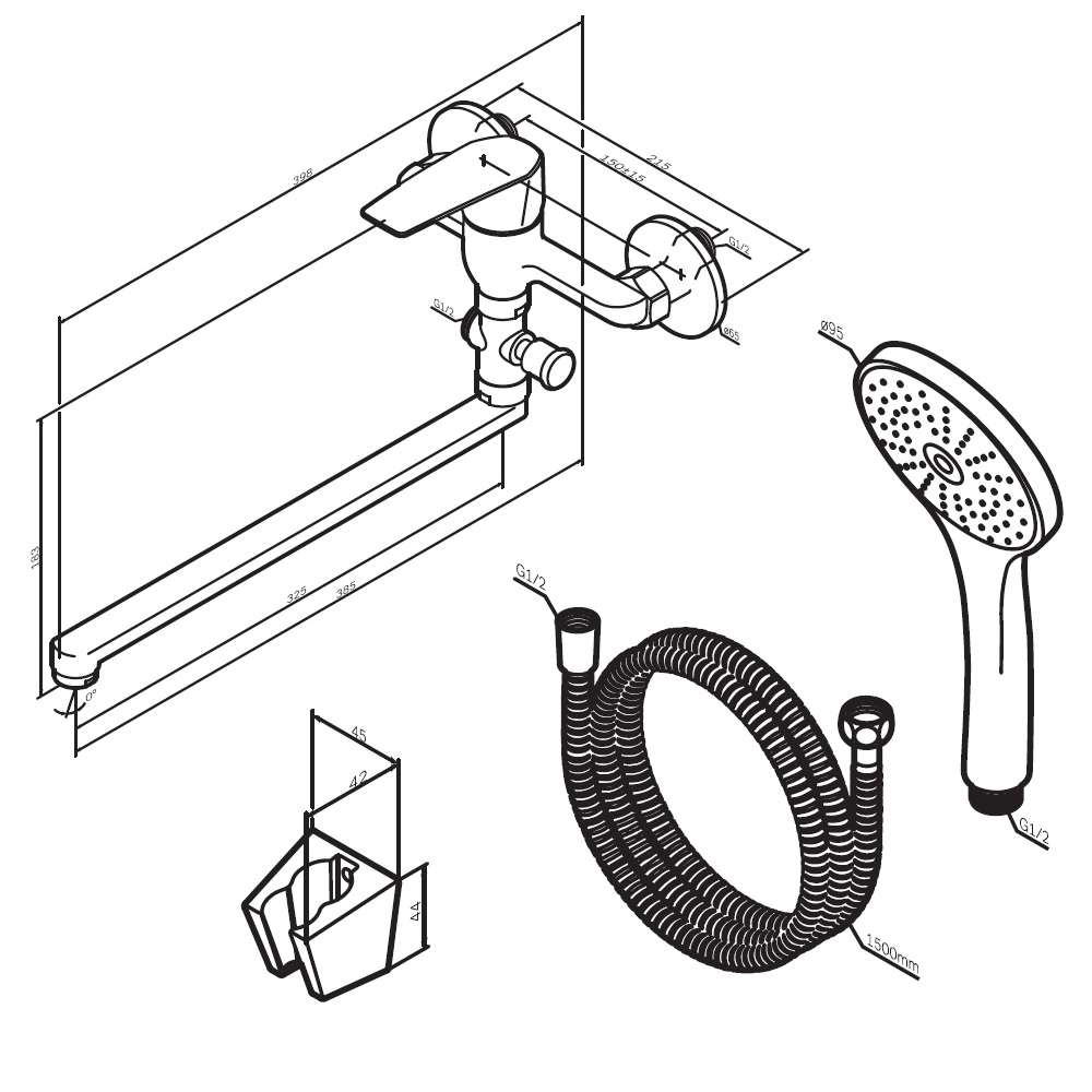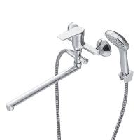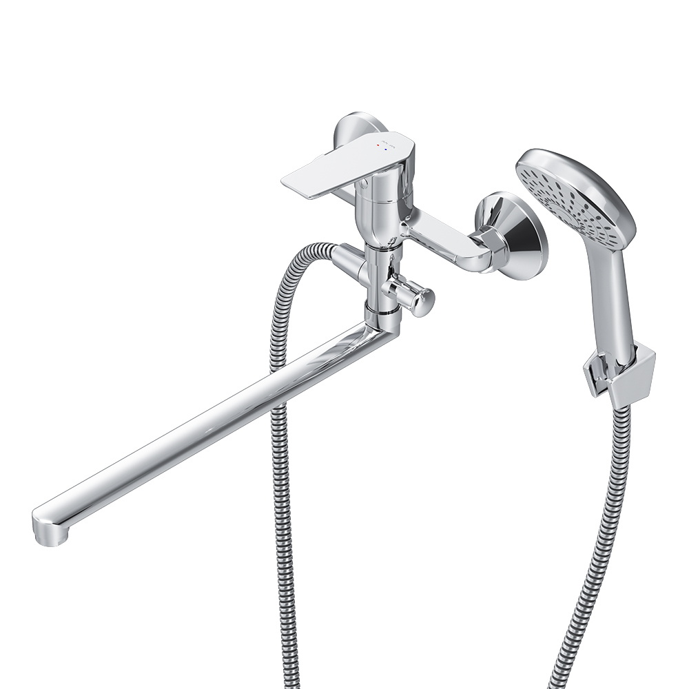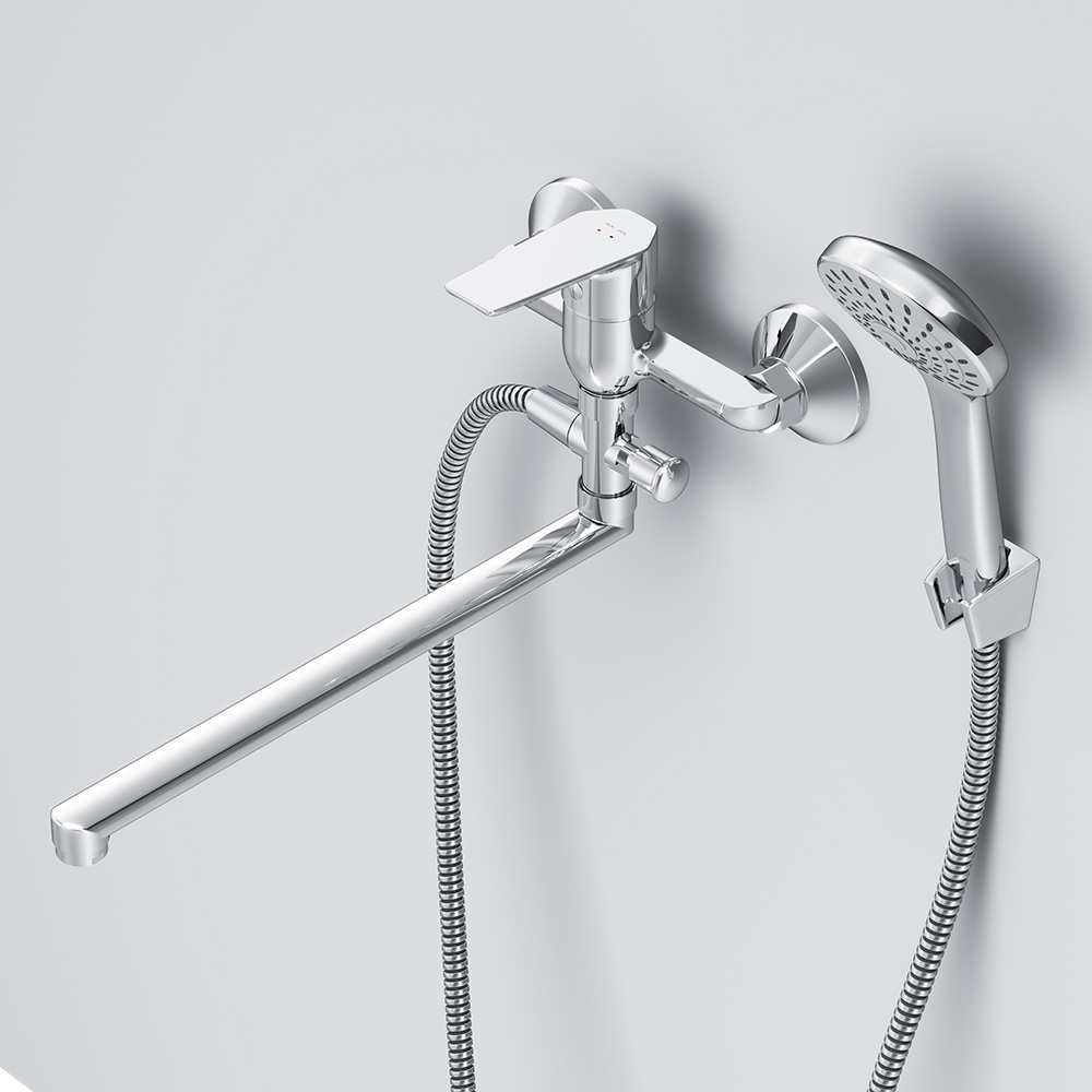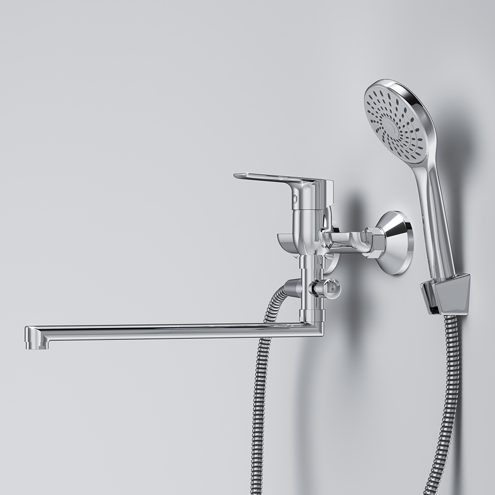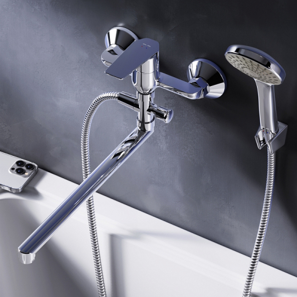Смеситель предназначен для монтажа на стену и имеет длину 398 мм, высоту 183 мм и ширину 215 мм, что делает его идеальным выбором для большинства ванных комнат. Длинный излив позволяет удобно использовать смеситель как для ванны, так и для раковины, что добавляет универсальности в его применение.