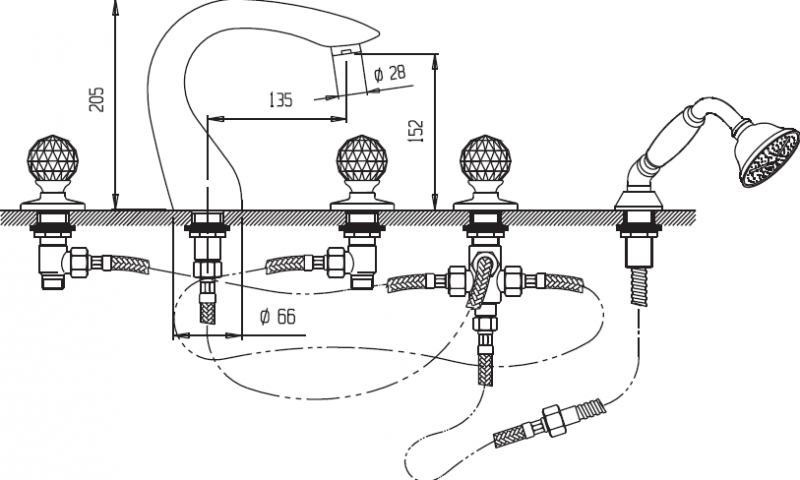 Смеситель предназначен для монтажа на борт ванны и оснащен коротким изливом длиной 13.5 см. Удобное вентильное управление позволяет легко регулировать поток воды, а керамическая кран-букса обеспечивает долговечность и надежность в эксплуатации. Модель требует 4 отверстия для монтажа и подходит для подводки диаметром 1/2".