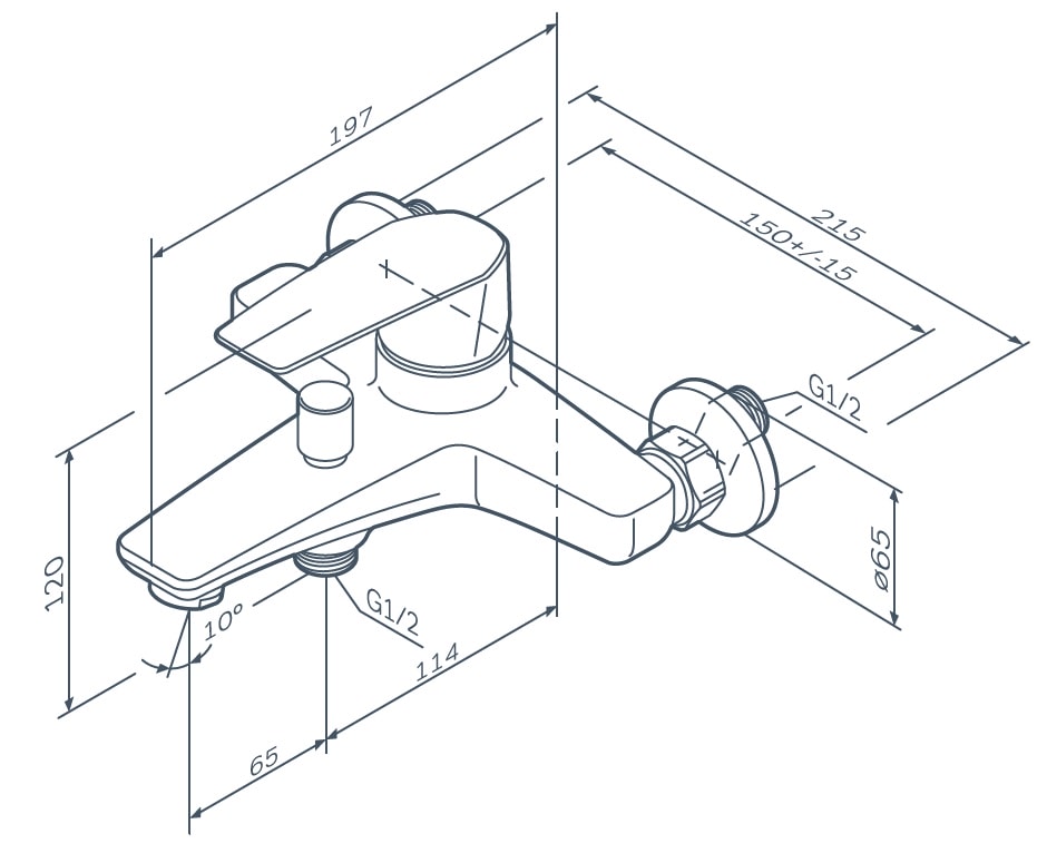 Смеситель предназначен для душа и устанавливается на стену, что позволяет сэкономить пространство и создать аккуратный вид. Его размеры: высота 120 мм, длина 197 мм и ширина 215 мм, что делает его универсальным для большинства ванных комнат.