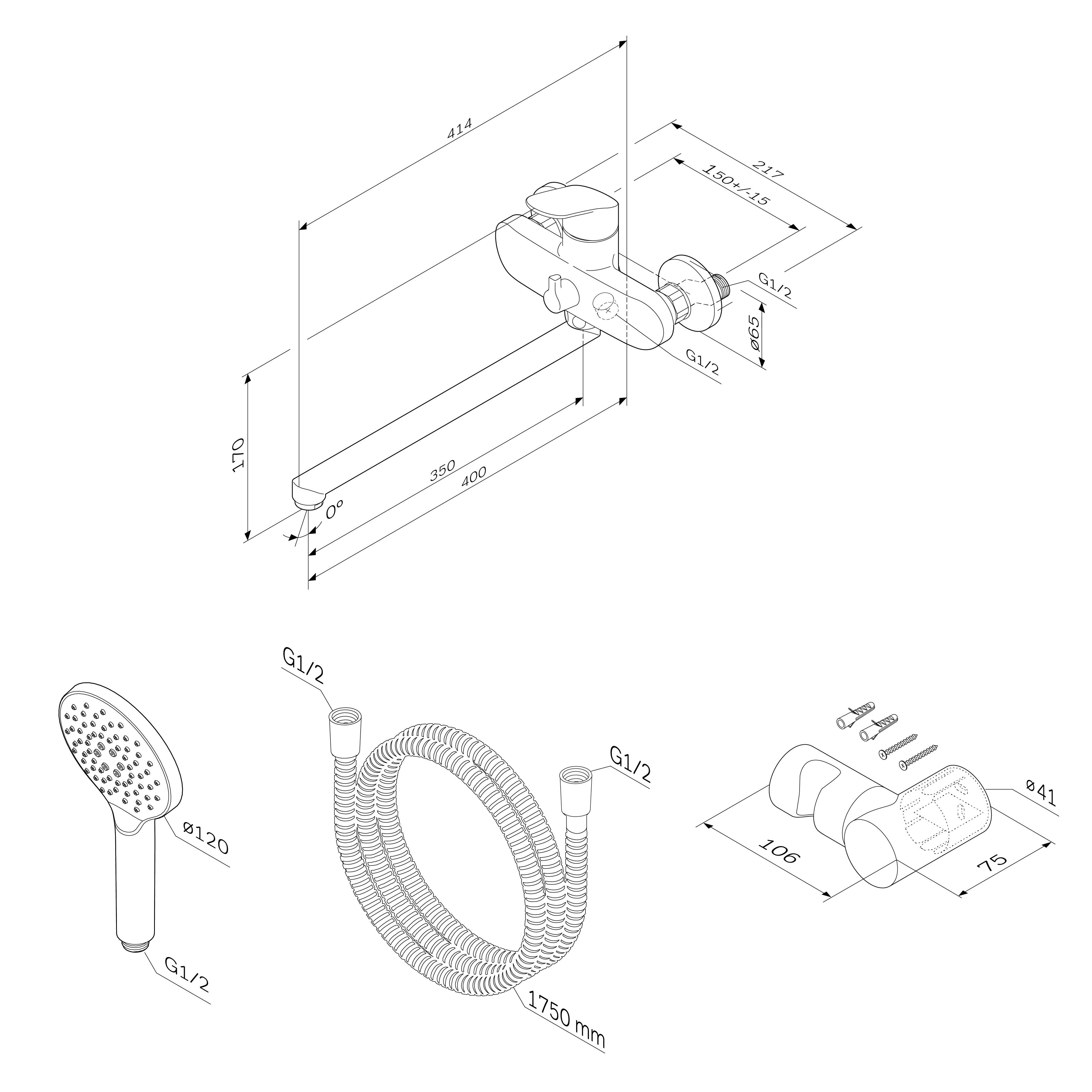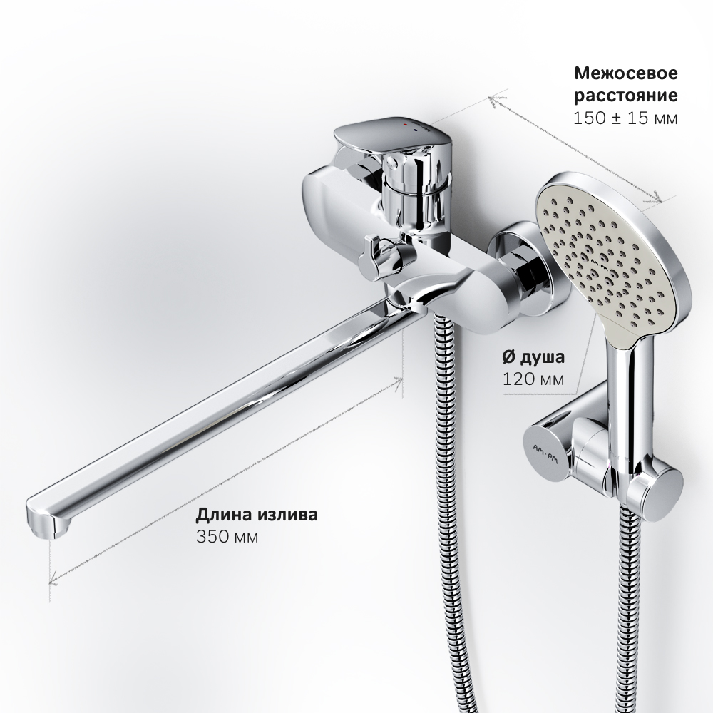 В комплекте с смесителем идет стильный душевой набор, который включает в себя ручной душ диаметром 120 мм с тремя режимами, настенный держатель с регулировкой угла наклона и душевой шланг с защитой от скручивания. Это делает использование смесителя еще более комфортным и приятным.