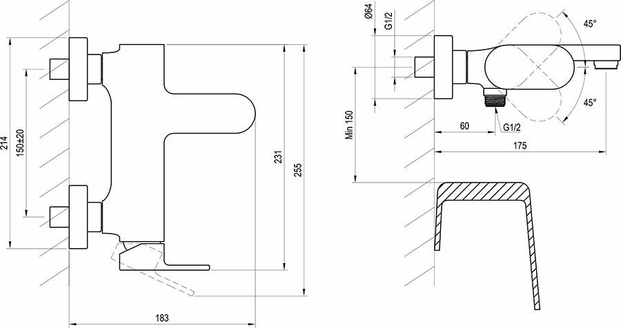 Смеситель имеет компактные размеры: длина 183 мм, ширина 231 мм и высота 64 мм, что делает его идеальным выбором для ванных комнат любого размера. Его короткий излив и традиционный вид излива обеспечивают удобство использования и стильный внешний вид.