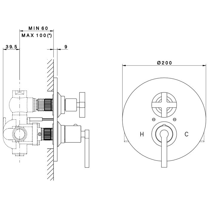 Смеситель предназначен для монтажа на стену, что позволяет сэкономить пространство и создать аккуратный вид. Управление смесителем осуществляется с помощью термостата, что обеспечивает точную настройку температуры воды и комфортное использование.