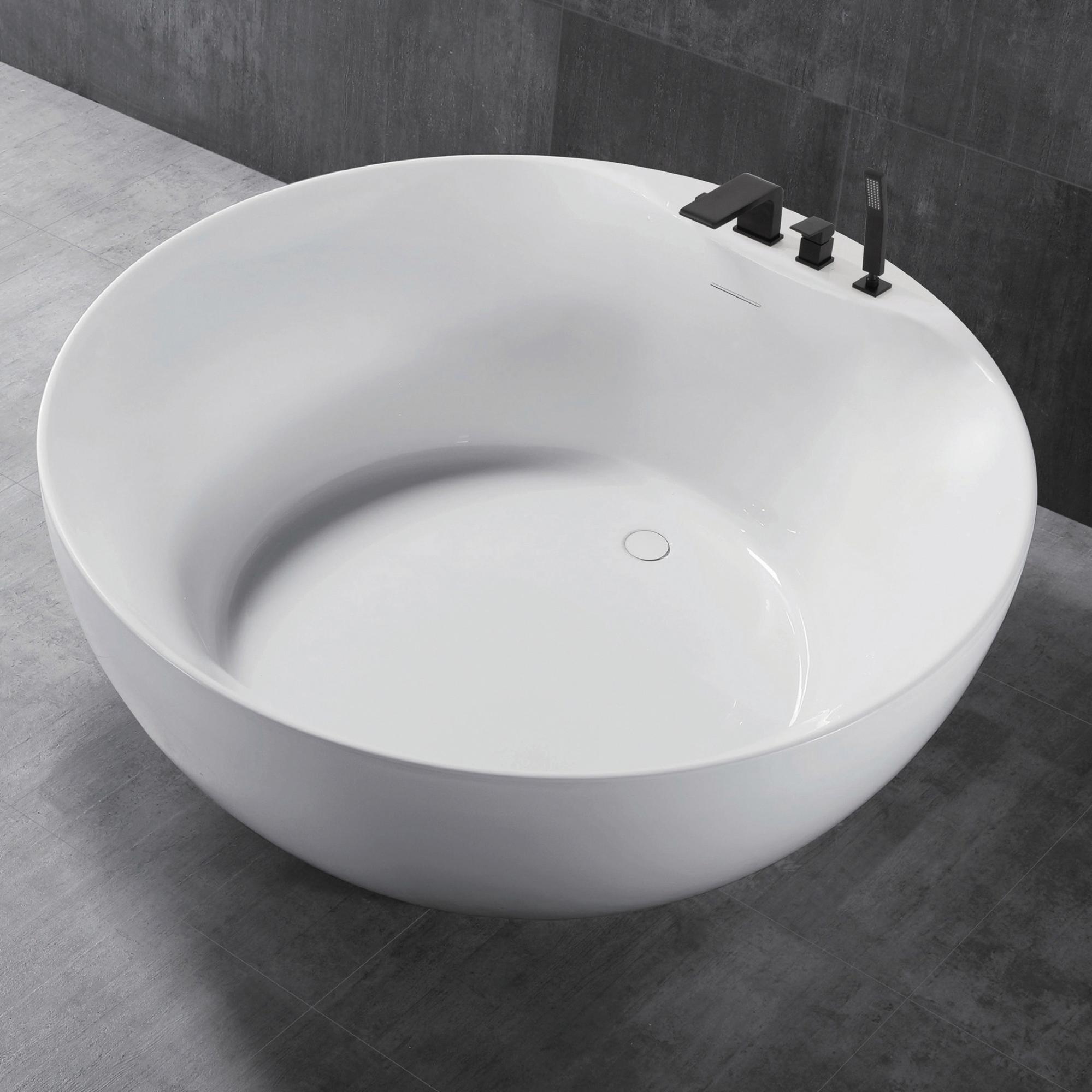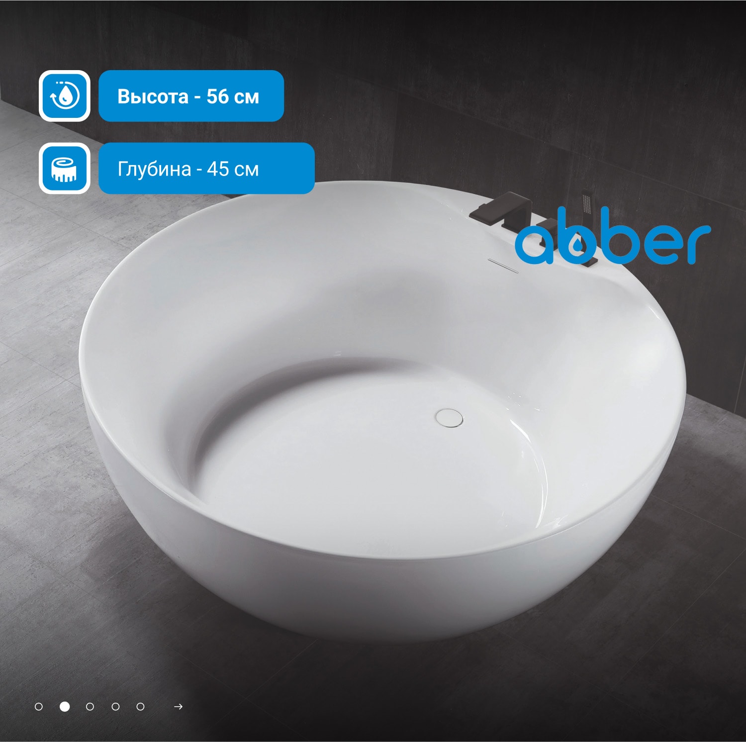 Ванна имеет круглую форму и размеры 1500 мм в длину и ширину, что делает её отличным выбором для просторных ванных комнат. Высота ванны составляет 560 мм, что обеспечивает комфортное использование. Тонкий борт, плавно переходящий в дно чаши, придаёт изделию элегантный вид и визуально увеличивает пространство.
