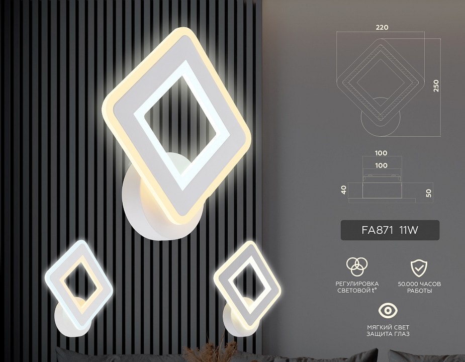 С одним квадратным плоским плафоном, выполненным в современном стиле, бра FA871 отлично впишется в интерьер вашей гостиной. Максимальная мощность лампы составляет 9 Вт, что обеспечивает достаточное освещение для площади до 4.5 м². В комплект входит светодиодная лампа, что гарантирует долговечность и экономию электроэнергии.