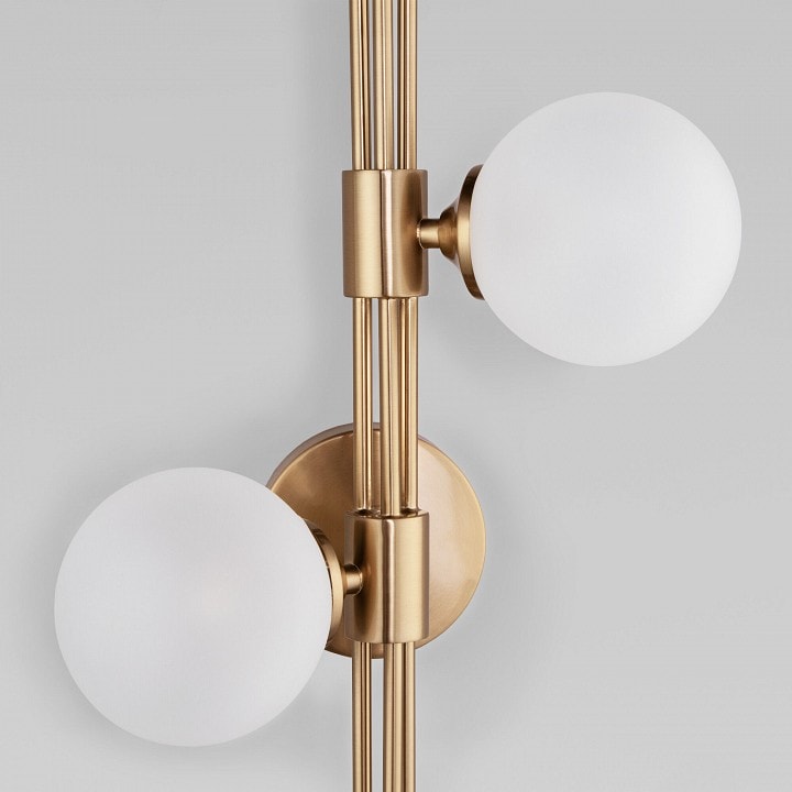 Бра выполнено в латунном цвете и относится к серии Volver, что подчеркивает его элегантность и утонченность. С размерами 750 мм в высоту и 220 мм в глубину, оно идеально впишется в любой интерьер, добавляя ему изысканности. Уникальная форма плафонов в виде сферы создает мягкое и равномерное освещение, направленное в стороны и вниз, что делает его отличным выбором для освещения стен.