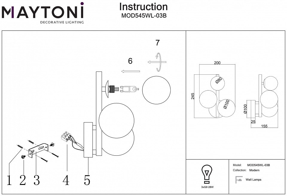 Бра оснащено тремя плафонами, которые направлены вперед, что обеспечивает равномерное распределение света. Максимальная мощность лампы составляет 28 Вт, а общее количество ламп — 3, что позволяет достичь общей мощности в 84 Вт. Обратите внимание, что лампы в комплекте отсутствуют, поэтому вы можете выбрать подходящие галогеновые лампы с цоколем G9, чтобы создать желаемое освещение.