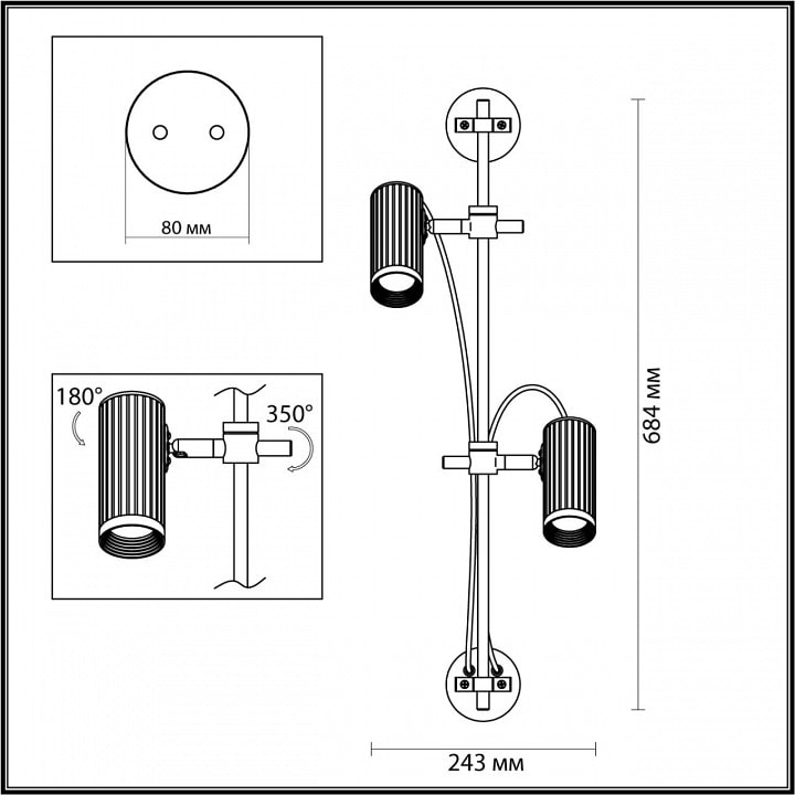 С высотой 684 мм и двумя плафонами, это бра обеспечит достаточное освещение для площади до 10 м². Каждый плафон имеет возможность регулировки направления, что позволяет вам настроить свет в соответствии с вашими потребностями. Бра работает на напряжении 220 В и поддерживает светодиодные лампы с цоколем GU10, максимальная мощность которых составляет 10 Вт.
