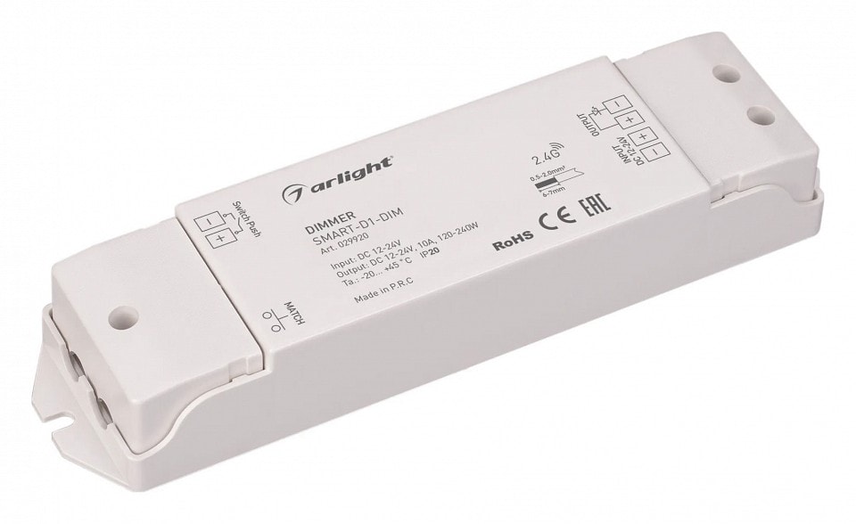 Контроллер-диммер Arlight SMART 029920 работает при напряжении питания от 12 до 24 В, что делает его универсальным для различных типов светильников. С его помощью вы сможете легко регулировать яркость освещения, создавая комфортную атмосферу в любом помещении.