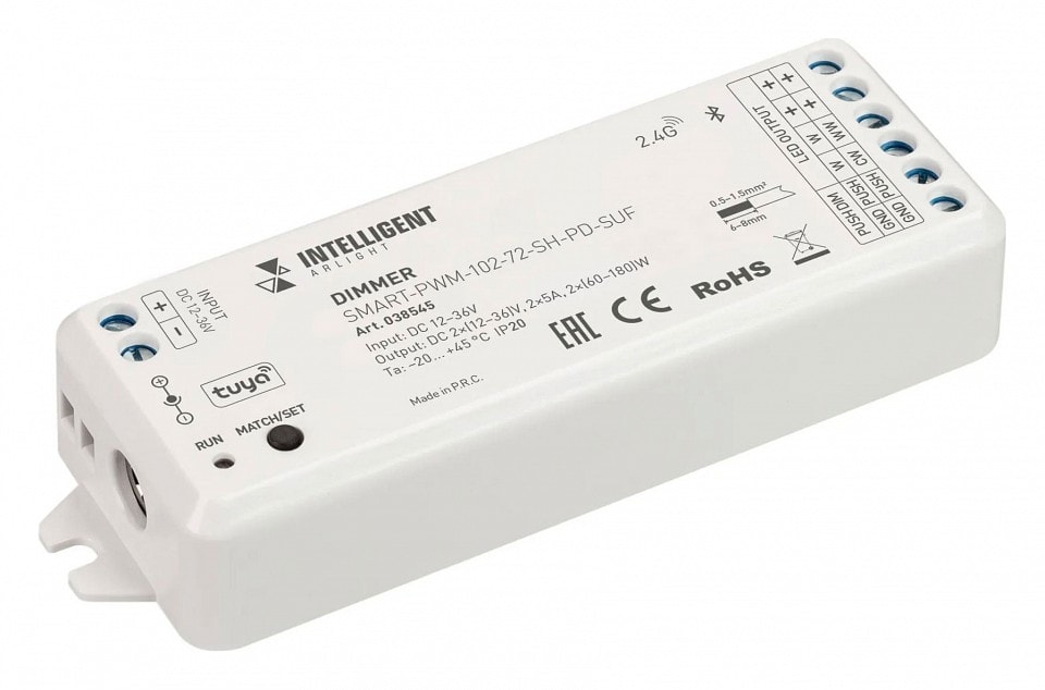 Контроллер-диммер Arlight TUYA 038545 совместим с системой умного дома, что позволяет управлять освещением через мобильное приложение. Это делает его отличным выбором для тех, кто ценит комфорт и современные технологии.