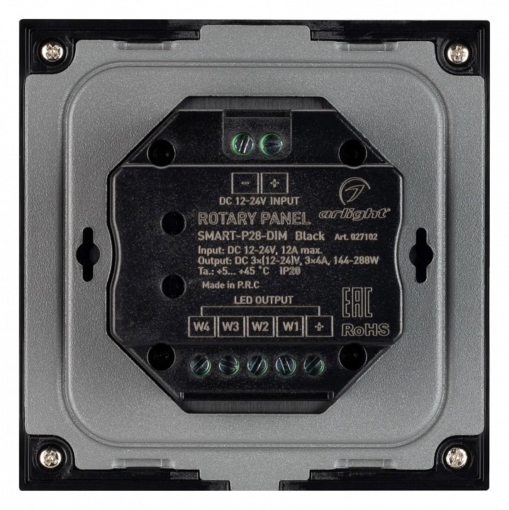 С артикулом ARLT_027102, данный диммер предназначен для встраивания в стену и работает при напряжении питания от 12 до 24 В. Он совместим с контроллерами-диммерами, что позволяет легко интегрировать его в существующую систему освещения. Общая мощность устройства составляет от 144 до 288 Вт, что делает его подходящим для различных типов освещения, включая LED-лампы.