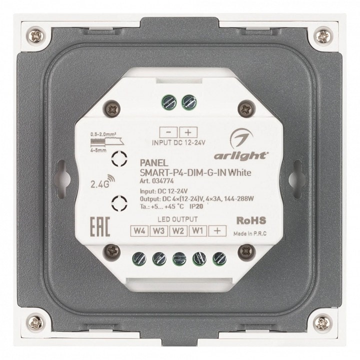Панель-диммер Arlight SMART 034774 предназначена для встраивания в стену и работает при напряжении питания от 12 до 24 В. С его помощью вы сможете регулировать яркость освещения, создавая комфортную атмосферу в любом помещении. Общая мощность устройства составляет от 144 до 288 Вт, что позволяет использовать его с различными источниками света.