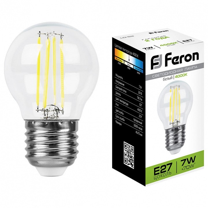 Светодиодная лампа Feron обладает мощностью 7 Вт и обеспечивает яркое, но мягкое освещение с цветовой температурой 4000K, что идеально подходит для работы и отдыха. Благодаря своему диаметру 45 мм и стандартному цоколю E27, лампа легко устанавливается в большинство светильников.