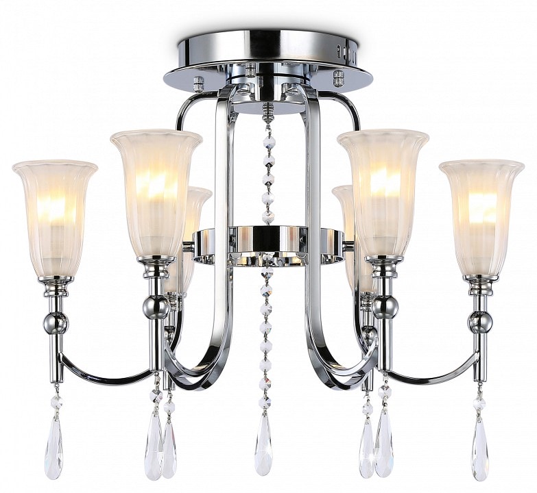 Люстра оснащена шестью плафонами в форме расходящегося колокола, которые направлены вверх, обеспечивая мягкое и равномерное освещение. Максимальная мощность каждой лампы составляет 40 Вт, что позволяет создать необходимую яркость в помещении. Общее количество ламп — 6, что дает возможность освещения площади до 240 Вт.