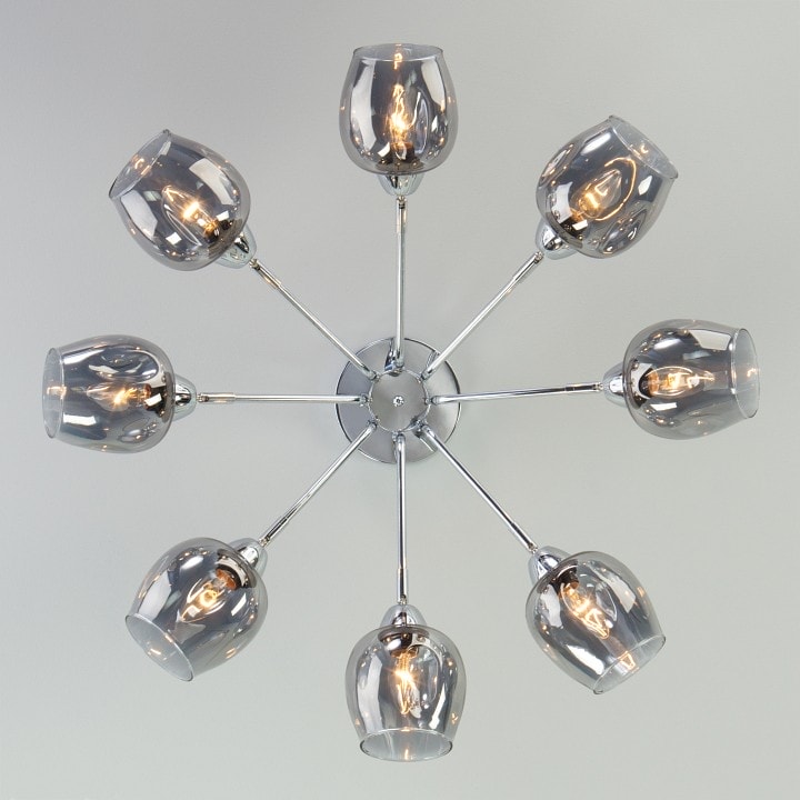 С диаметром 740 мм и весом 3.2 кг, люстра легко впишется в любое пространство, добавляя ему изысканности. Стильные плафоны в форме цветка тюльпана направлены в стороны и вниз, создавая мягкое и равномерное освещение. Общее количество плафонов составляет 8, что позволяет использовать максимальную мощность ламп до 40 Вт каждая, обеспечивая общую мощность в 320 Вт.