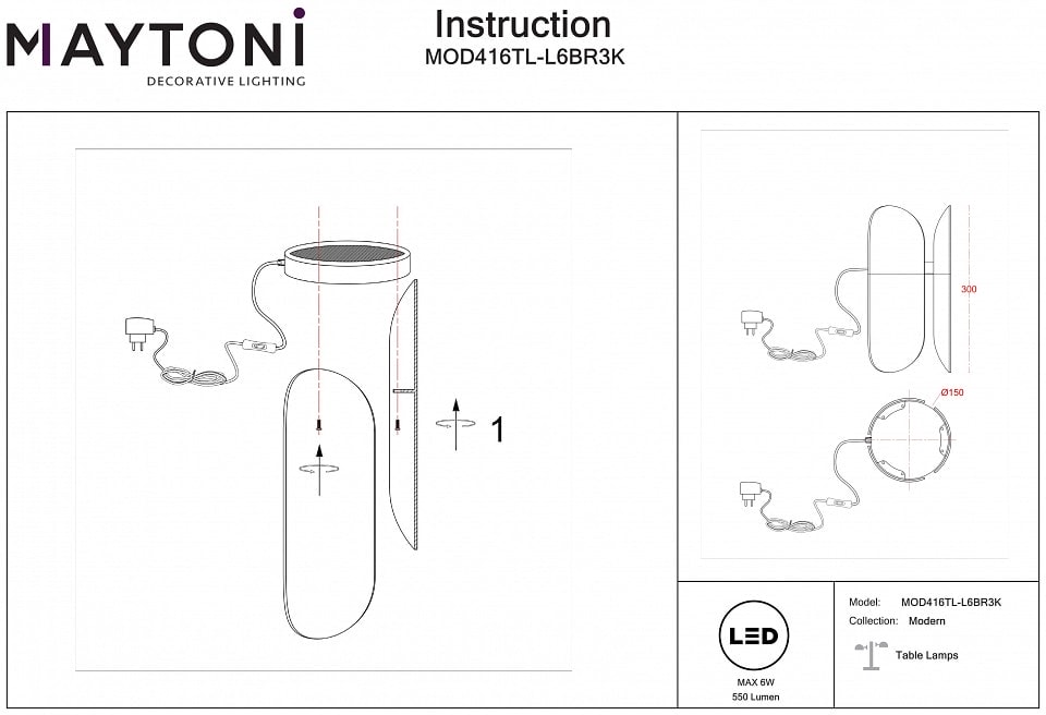 С диаметром 150 мм и высотой 300 мм, лампа обладает компактными размерами, что делает её идеальной для размещения на столе в гостиной или рабочем кабинете. Лампа оснащена одним светодиодным плафоном, который направлен вверх, обеспечивая мягкое и равномерное освещение площади до 3 м². Максимальная мощность лампы составляет всего 6 Вт, что делает её энергоэффективной и экономичной в использовании.