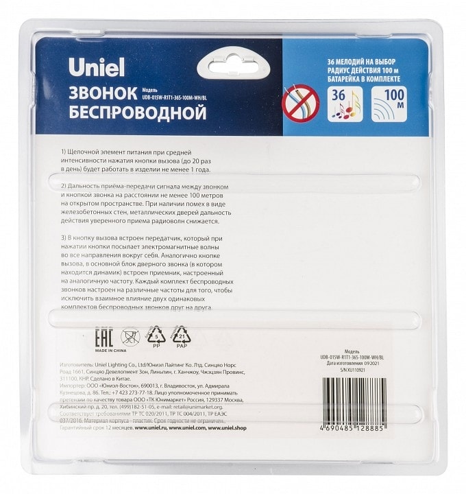 Размер упаковки составляет 210x180x35 мм, что делает его удобным для транспортировки и хранения. Не упустите возможность сделать свой дом более комфортным и безопасным с помощью беспроводного звонка Uniel UDB UL-00006434.