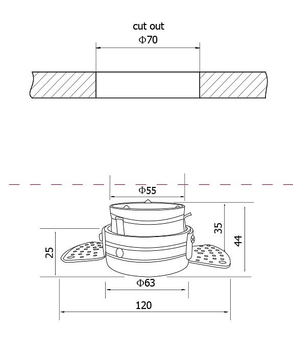 Светильник имеет компактные размеры: глубина составляет всего 44 мм, а размер врезного отверстия – 70x44 мм. Это позволяет легко установить его в потолок или стену, что делает его идеальным для использования в кладовой или других помещениях. Максимальная мощность лампы составляет 50 Вт, а тип цоколя – GU10, что обеспечивает широкий выбор ламп для вашего освещения.