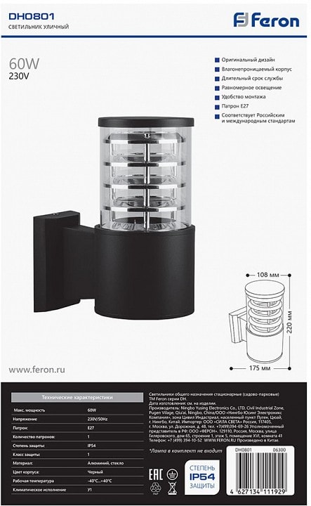 Светильник Feron Saffit DH0801 6301 не только функционален, но и эстетически привлекателен. Он станет отличным акцентом на стене вашего дома или дачи, создавая атмосферу уюта и комфорта. Установка светильника не требует специальных навыков, что делает его доступным для каждого.