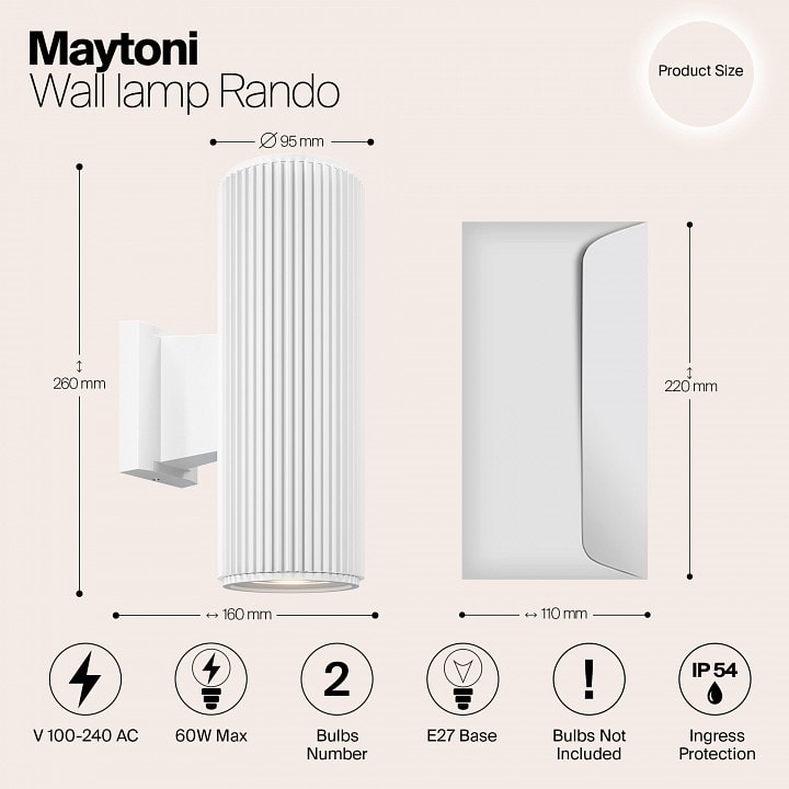 Светильник Maytoni Rando O419WL-02W весит всего 1.02 кг, что делает его легким и удобным в установке. Размер упаковки составляет 105x170x275 мм, что позволяет легко транспортировать и хранить товар.