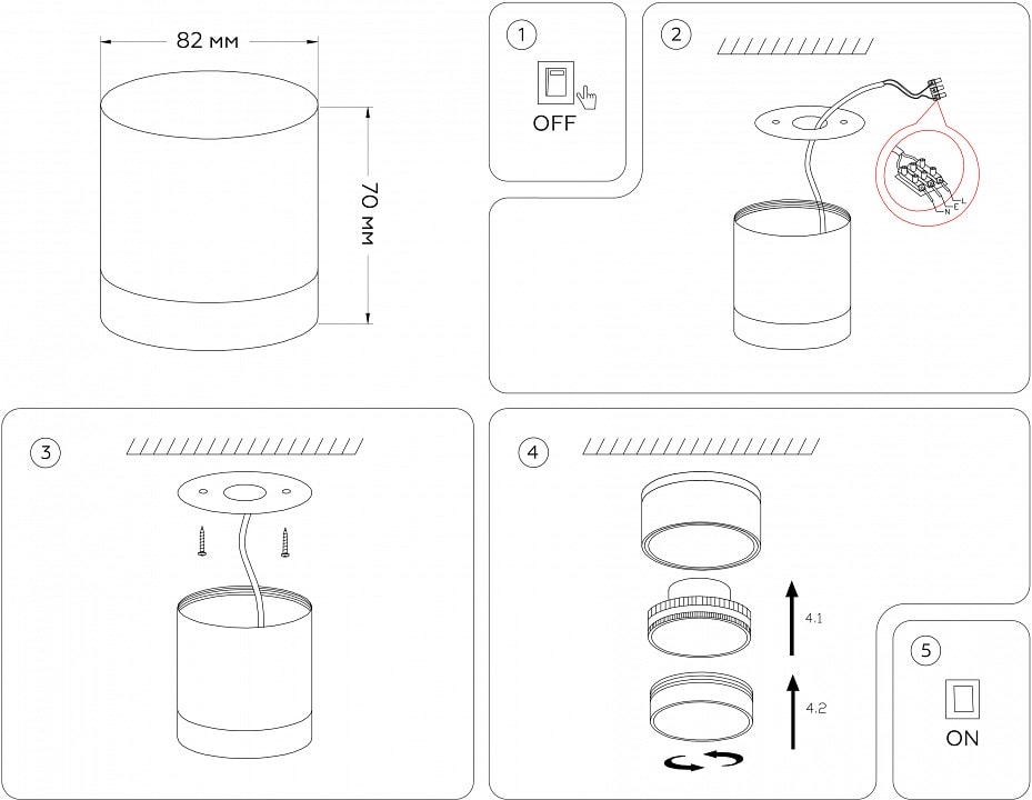Светильник оснащен одним плафоном, который направлен вниз, обеспечивая равномерное и комфортное освещение площади до 6 м². Максимальная мощность лампы составляет 12 Вт, что позволяет использовать светодиодные лампы типа GX53 для экономии электроэнергии и долговечности. Обратите внимание, что лампы в комплект не входят, что дает вам возможность выбрать освещение по своему вкусу.