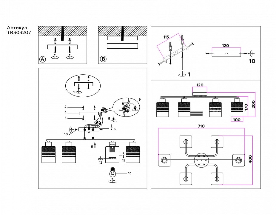 Светильник оснащен шестью плафонами, которые направлены вниз, обеспечивая равномерное и яркое освещение. Максимальная мощность лампы составляет 60 Вт, что позволяет использовать лампы накаливания с цоколем E27. Обратите внимание, что лампы в комплект не входят, что дает вам возможность выбрать освещение по своему вкусу.