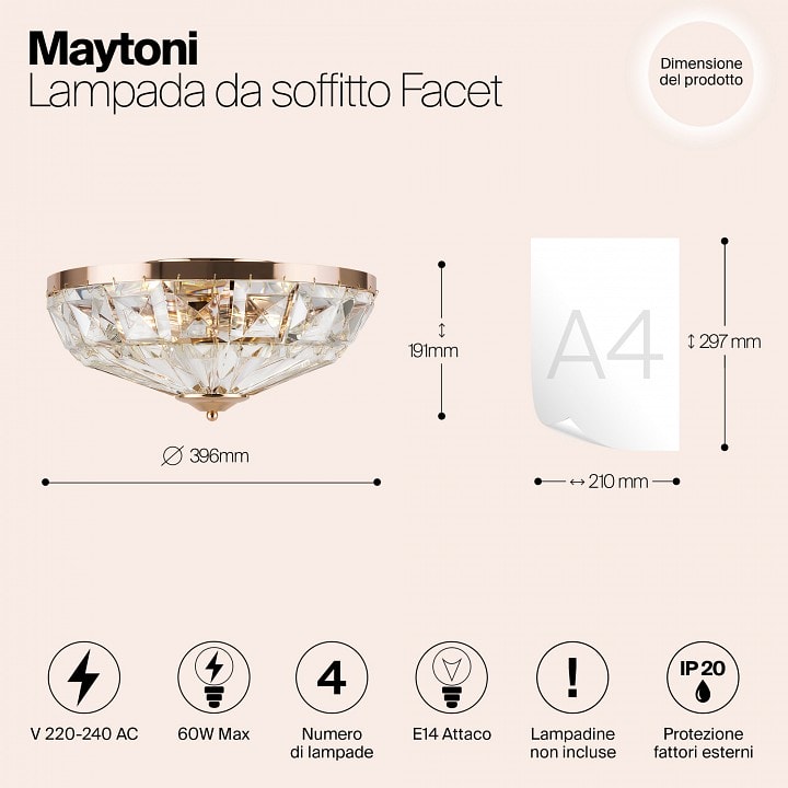 Светильник Maytoni Facet MOD094CL-04G имеет общую мощность 240 Вт и может использовать до четырех ламп, что делает его отличным выбором для больших пространств. Обратите внимание, что лампы в комплект не входят, что позволяет вам выбрать именно те источники света, которые подойдут вашему интерьеру.