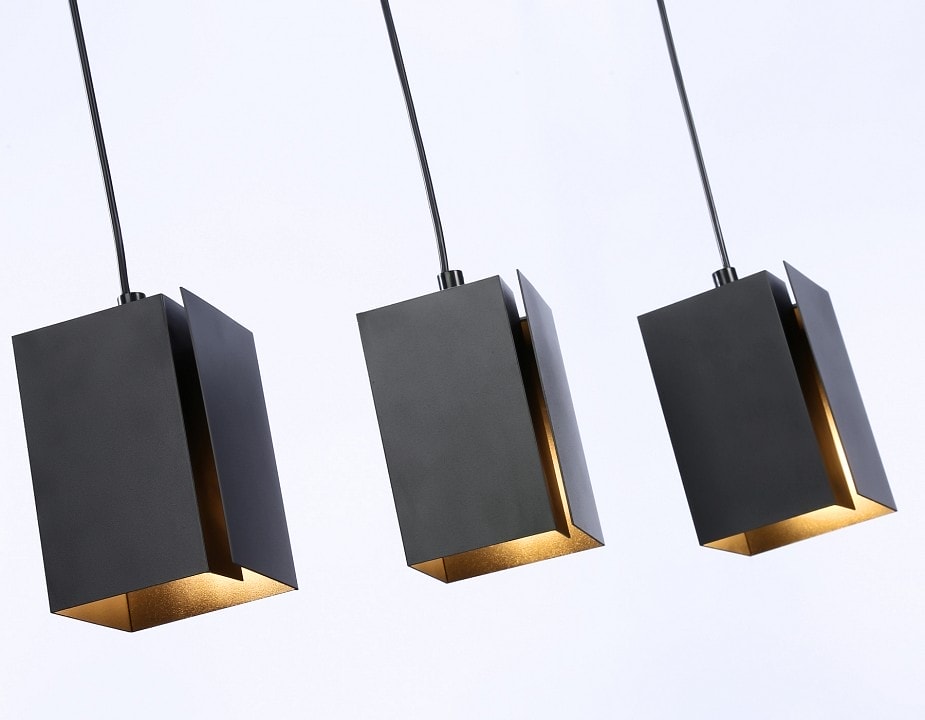 Светильник оснащен тремя плафонами в форме квадратной пирамиды, которые направлены вниз, что позволяет равномерно распределять свет по всему помещению. Максимальная мощность лампы составляет 40 Вт, а общее количество ламп — 3, что обеспечивает мощность освещения до 120 Вт. Обратите внимание, что лампы в комплект не входят, поэтому вы можете выбрать подходящие по вашему вкусу.