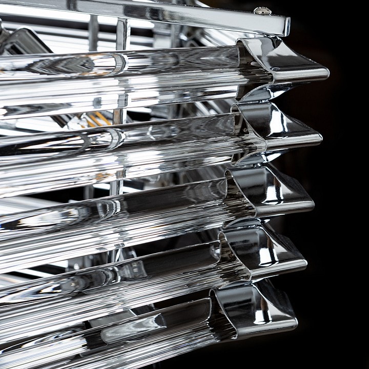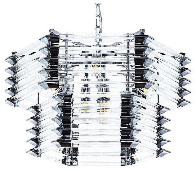Светильник имеет диаметр 600 мм и высоту 310 мм, что позволяет ему гармонично вписаться в различные пространства. Его уникальная форма плафонов в виде многоугольной призмы создает эффектный световой поток, направленный как вверх, так и вниз, что добавляет глубину и объем в интерьер.