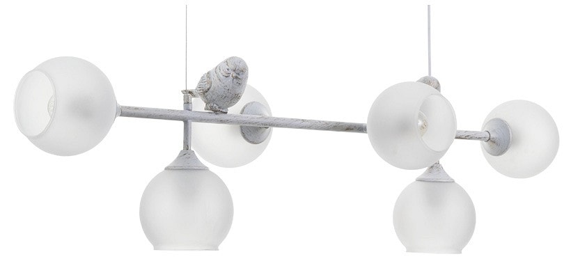С высотой 1200 мм и весом 2.879 кг, светильник легко устанавливается на потолок и подходит для различных стилей оформления. Он оснащен шестью плафонами, которые направлены вниз, обеспечивая равномерное и мягкое освещение. Каждый плафон имеет сферическую форму, что добавляет дополнительный шарм и оригинальность.