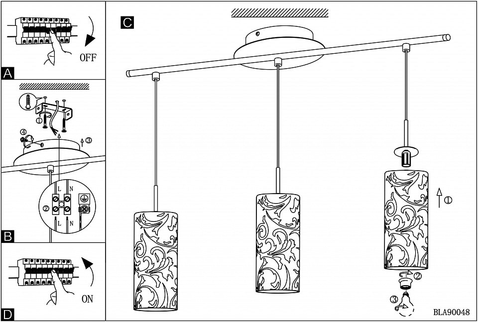 Светильник имеет три плафона, направленных вниз, что создает мягкое и равномерное освещение. Обратите внимание, что лампы в комплекте отсутствуют, но вы можете выбрать лампы с цоколем E27 по вашему вкусу. Максимальная общая мощность составляет 180 Вт, что позволяет использовать различные типы ламп, включая лампы накаливания.