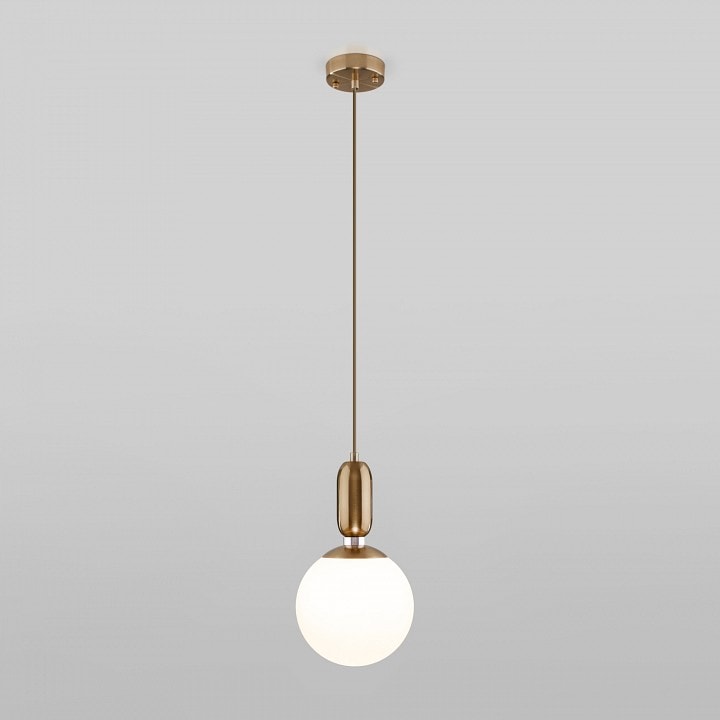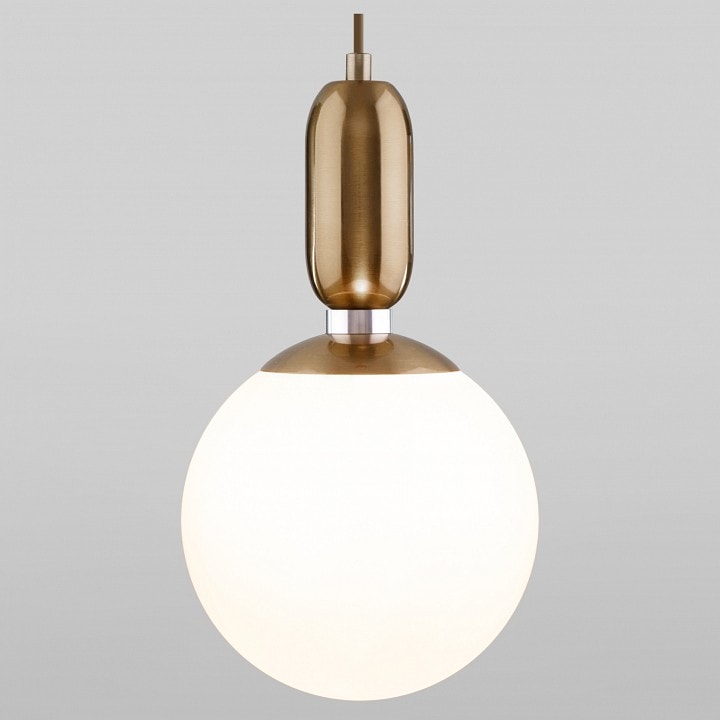 Светильник имеет диаметр 180 мм и высоту 435 мм, что делает его компактным и удобным для размещения в любом интерьере. Латунный корпус придаёт изделию элегантный вид, а форма плафона в виде сферы добавляет оригинальности. Направление света вниз позволяет равномерно освещать рабочие зоны, что особенно важно на кухне.