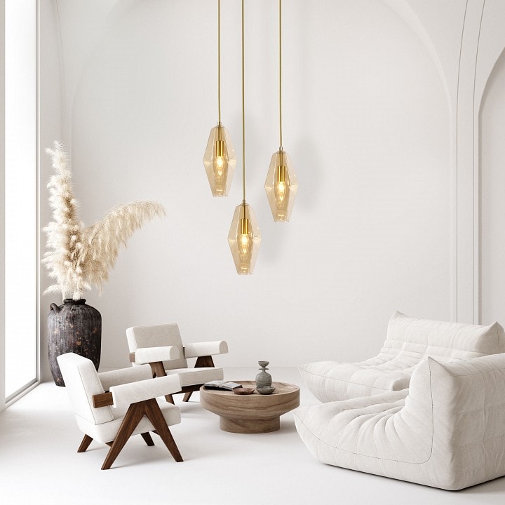 Светильник выполнен в стиле модерн, что делает его универсальным для различных интерьеров. Его янтарный цвет добавляет тепла и уюта, а форма плафонов в виде двойного конуса придает оригинальности. Подвесной светильник Eurosvet Prism идеально подходит для размещения на потолке, создавая акцент в вашем помещении.