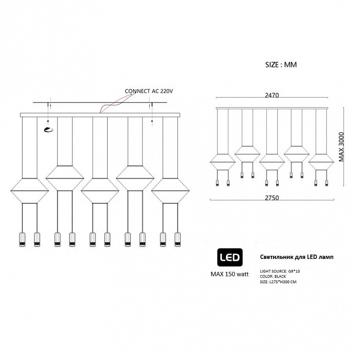 С высотой 3000 мм и 10 плафонами, светильник обеспечивает мощное освещение, способное осветить площадь до 75 м². Максимальная мощность лампы составляет 15 Вт, что делает его экономичным и эффективным решением для вашего дома. Обратите внимание, что лампы в комплекте отсутствуют, но вы можете выбрать светодиодные лампы с цоколем G9, которые идеально подойдут для этого светильника.