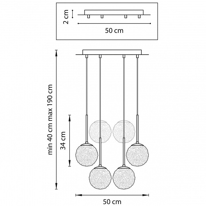 С диаметром 500 мм и высотой 400 мм, светильник Bari привлекает внимание и создает эффектный акцент в вашем пространстве. Он оснащен шестью плафонами, направленными вниз, что обеспечивает равномерное и мягкое освещение. Максимальная мощность лампы составляет 40 Вт, а общая мощность достигает 240 Вт, что позволяет использовать светильник для освещения больших помещений.