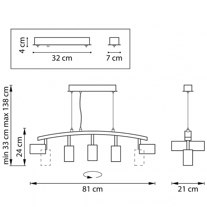 С высотой 330 мм и весом 2.53 кг, светильник легко устанавливается на потолок и не занимает много места. Он оснащен пятью плафонами, которые направлены вниз, обеспечивая равномерное и яркое освещение. Максимальная мощность лампы составляет 50 Вт, а общая мощность достигает 250 Вт, что позволяет использовать светильник для освещения больших пространств.