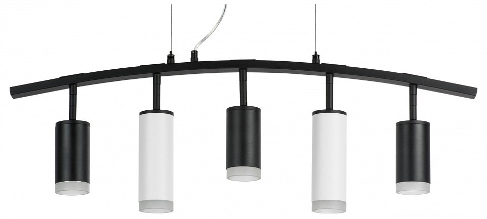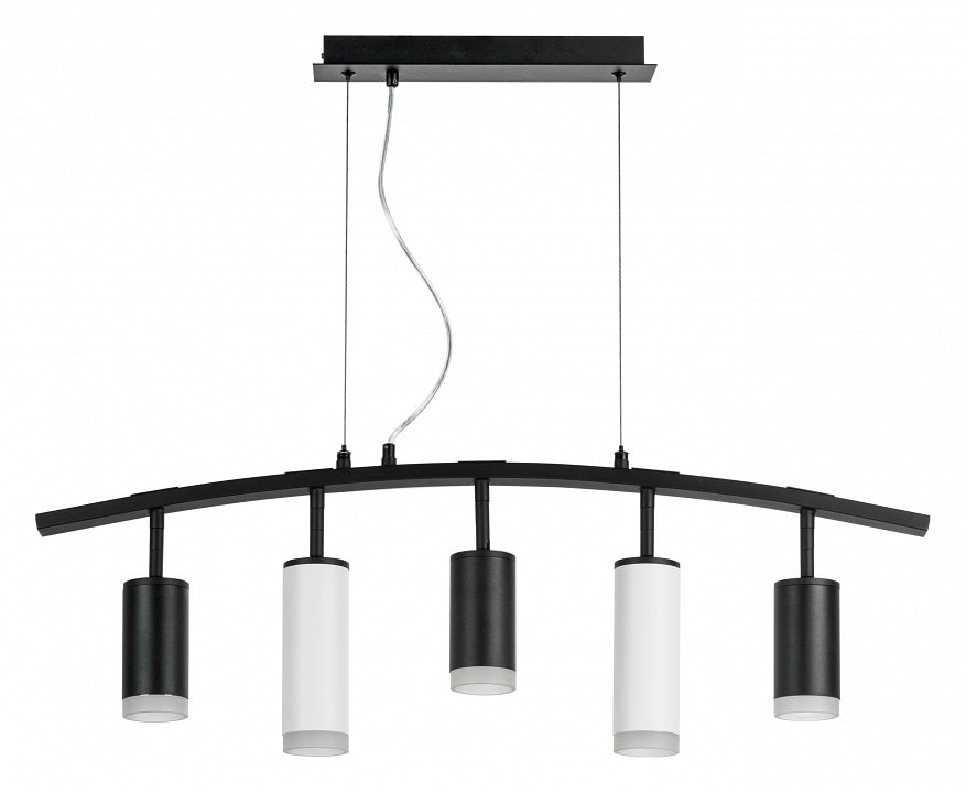 Светильник имеет высоту 395 мм и состоит из пяти плафонов, которые направлены вниз, обеспечивая равномерное и яркое освещение. Каждый плафон выполнен в форме цилиндра, что придаёт изделию элегантный и современный вид. Максимальная мощность лампы составляет 50 Вт, а общая мощность светильника достигает 250 Вт, что позволяет использовать его в помещениях с различными потребностями в освещении.