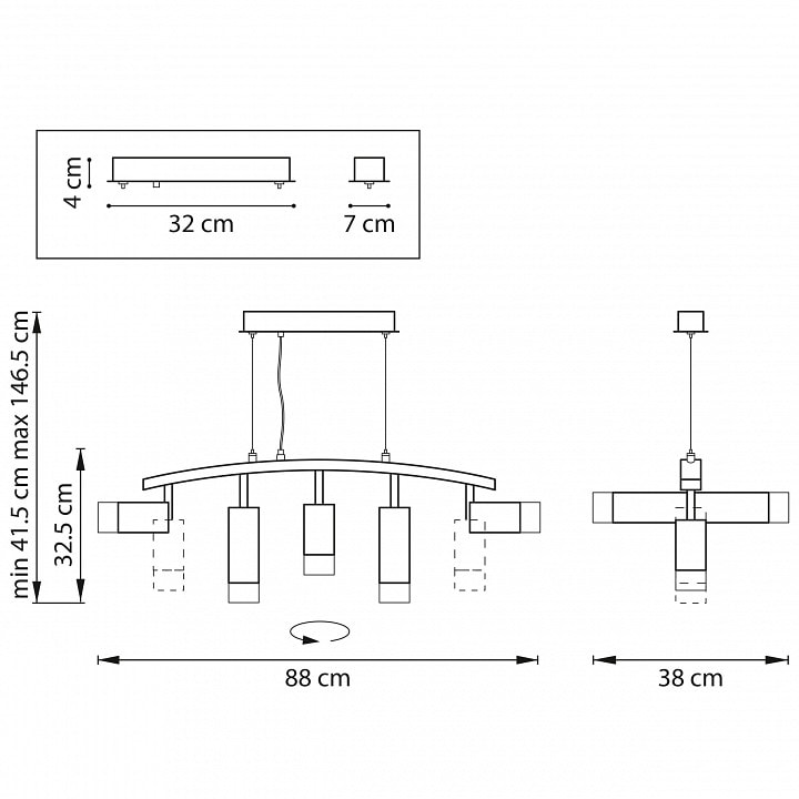 С высотой 415 мм и весом 2.84 кг, светильник легко устанавливается на потолок и не занимает много места. Он оснащен пятью плафонами, которые направлены вниз, обеспечивая равномерное и яркое освещение. Максимальная мощность лампы составляет 50 Вт, а общая мощность достигает 250 Вт, что позволяет использовать его в помещениях с различными потребностями в освещении.