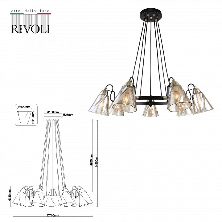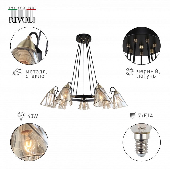 С диаметром 710 мм и высотой 800 мм, светильник Rivoli Cathy привлекает внимание и создает эффектный акцент в вашем пространстве. Он оснащен 7 плафонами, которые можно направлять в любое направление, что позволяет вам настроить освещение под ваши нужды. Максимальная мощность лампы составляет 40 Вт, а общее количество ламп – 7, что обеспечивает яркое и равномерное освещение.