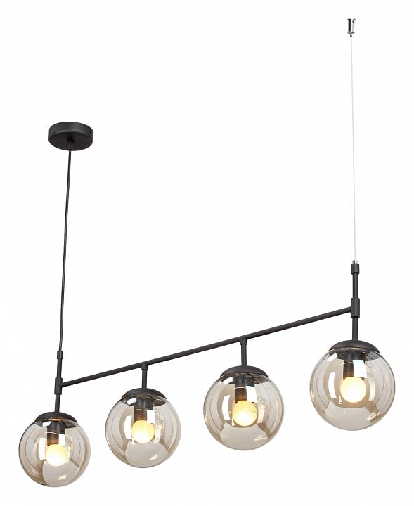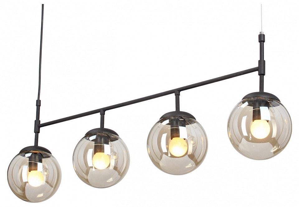 Светильник имеет высоту 1210 мм и состоит из четырех плафонов, которые направлены вниз, обеспечивая равномерное освещение. Каждый плафон имеет сферическую форму, что добавляет элегантности и оригинальности. Максимальная мощность лампы составляет 40 Вт, а общее количество ламп — 4, что позволяет достичь общей мощности в 160 Вт. Обратите внимание, что лампы в комплекте отсутствуют, поэтому вы можете выбрать подходящие лампы с цоколем E27, чтобы создать желаемую атмосферу.