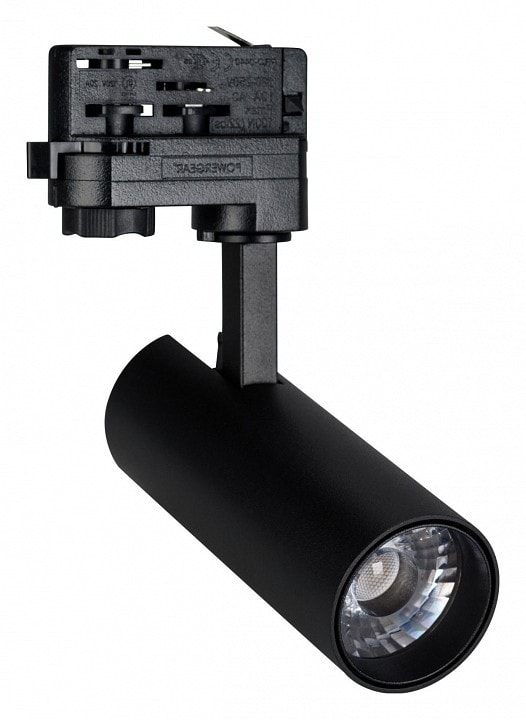 Светильник работает от сети с напряжением 220 В и требует трехфазный трек для установки. Он использует светодиодные лампы (LED), которые обеспечивают яркий и экономичный свет, что делает его идеальным выбором для офисных помещений.