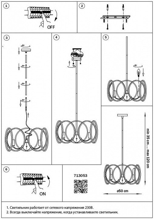 С диаметром 500 мм и высотой 350 мм, светильник идеально подходит для установки на потолке. Он оснащен одним плафоном, который можно направить вверх или вниз, что позволяет регулировать световой поток в зависимости от ваших предпочтений. Максимальная мощность лампы составляет 40 Вт, а тип цоколя - E14, что делает его совместимым с различными лампами накаливания.