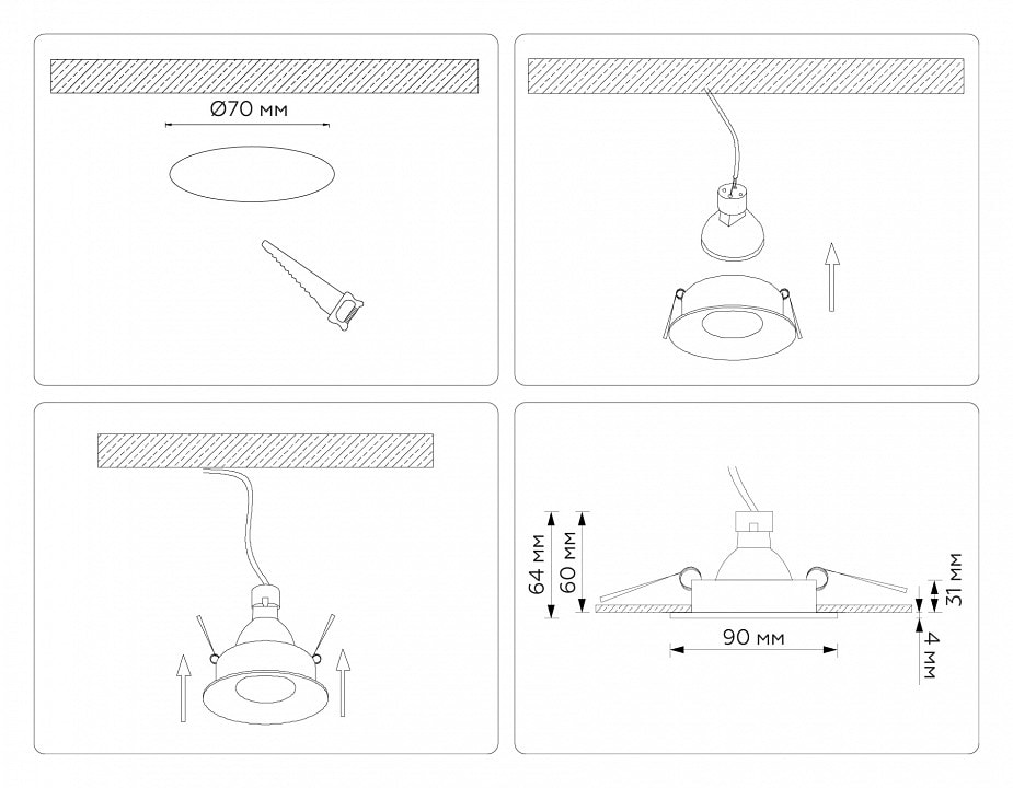 Светильник имеет степень пылевлагозащиты IP-20, что делает его идеальным для использования в помещениях с нормальной влажностью, таких как гостиные. Размер врезного отверстия составляет 70 мм, а размеры упаковки — 95x95x40 мм, что позволяет легко и удобно установить светильник.